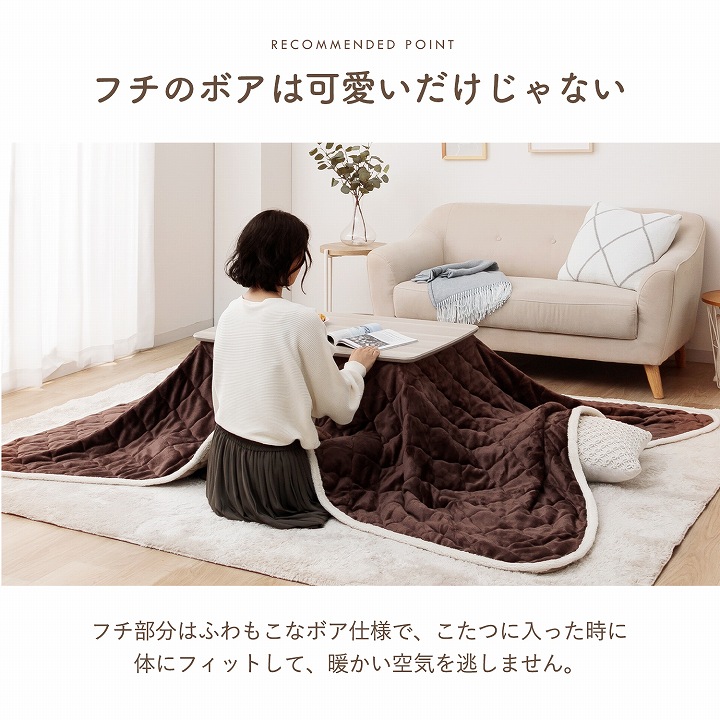 | ■こたつ掛布団とこたつ台のお得な2点セットです。 ■こたつ掛布団の用途はこたつ上掛けカバーだけでなく、こたつ掛け布団・中掛け毛布・ブランケットとしてなど使い方は様々です。 ■リバーシブル仕様で、両面にふんわりやわらかなフランネル素材を使用しています。 ■可愛いキルティングも施されておりますので、綿ズレを防止できて使い心地も抜群です。 ■フチ部分はふわもこなボア仕様で、こたつに入った時に体にフィットします。 ■洗濯機で洗えるので清潔にご使用できます。(洗濯ネットをご使用ください) ■コンパクトに収納できるので、収納スペースが少ない方にもおすすめです。 ■こたつ台は、ホワイトインテリア風デザイン。 ■高さの調整ができる継脚タイプです。 ■ソファと合わせてローテーブルとしても使いやすい高さです。 ■脚はスリムタイプでオールシーズンご使用いただけるデザインです。 ■天板滑り止め付きでずれにくくなっています。 ■安心のメトロ製ヒーター。 |