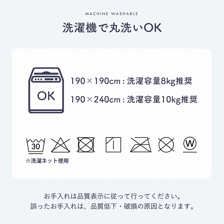 | 液温は30℃を限度とし、洗濯機で洗濯ができる。(洗濯ネットをご使用ください) 干し方=日陰のつり干しがよい。 |
