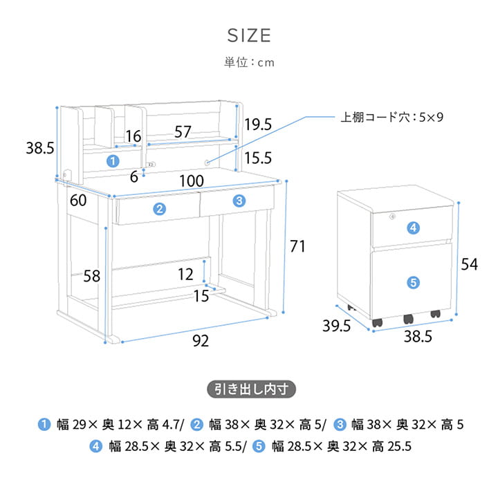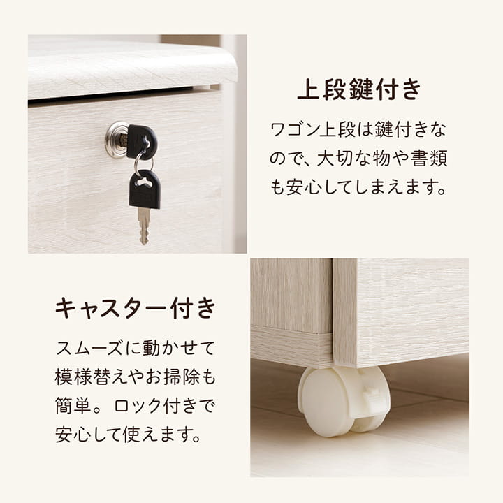 【デスク】104.5×62×23.5cm/32.6kg 【上棚】103×38.5×21.5cm/11.6kg 【ワゴン】43.5×43.5×54cm/17.4kg |