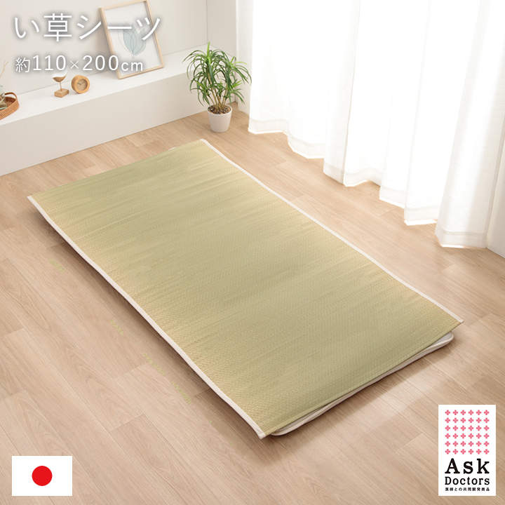 | ■ 医師60名の意見・アイデアから快適な睡眠をサポートするい草寝具をメーカーと共同開発した「アスクドクターズ」シリーズ。長時間、肌に接する寝具だからこそ、自然素材を使い、やわらかな質感にこだわりました。 ■ 国産(九州産)のい草を使用した敷きパッドです。一本一本が太く、表皮が厚く繊維がキメ細かいので弾力性があり、耐久性に優れています。 ■ い草を刈り取った後に行われる、泥染めという工程を省き、素材そのままの無垢のい草を使用しています。粉っぽさがなく、すべすべとした滑らかな肌触りに仕上げました。 ■ 四隅にゴムバンドが付いており、ずれにくくなっています。 ■ い草には吸湿力・調湿効果があり、汗を吸収してさらっと快適な睡眠をサポートします。 ■ 快眠い草の効能として 1.綿の約2.5倍の吸湿力 2.蒸れにくい。汗による湿気を吸うことにより温度を下げ快適な就寝を促します。 3.汗のにおいを軽減。汗のにおいの元となる化学物質を90%以上抑えます。 などがあります。暑苦しい日本の夏でも汗のジメジメを軽減してくれます。 |