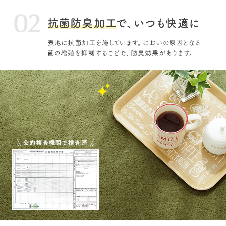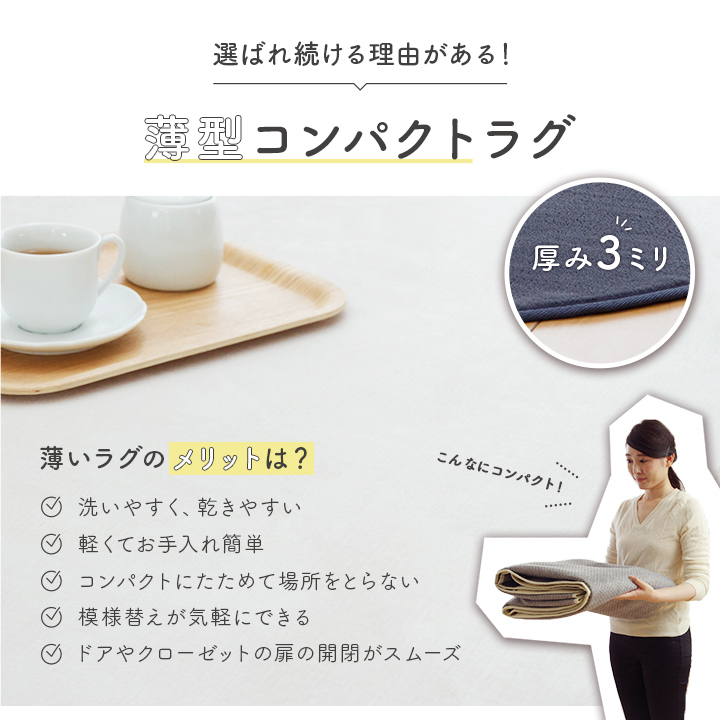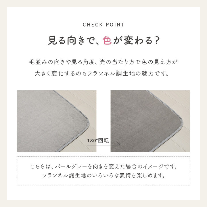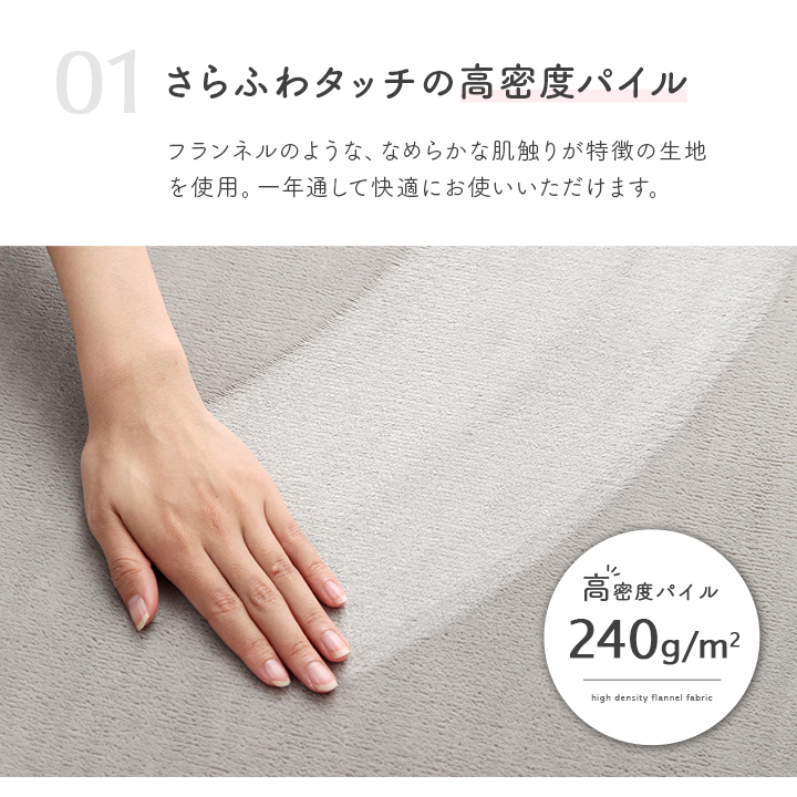 | ■表地に抗菌防臭加工を施した、ラグカーペットです。 ■表地にはフランネル調の起毛された生地を使用しています。しっとりなめらかで柔らかい肌触りが特徴です。 ■軽量で持ち運びが楽々です。薄手で小さく折りたたむことができますので、収納時にも場所を取りません。 ■フローリングを傷つけにくいよう、裏には不織布を貼っています。 ■軽量で薄手になりますのでご家庭の洗濯機で簡単に洗えるウォッシャブル仕様、清潔にご使用頂けます。 ■ホットカーペットカバーとしてもご使用頂けます。 ■季節を選ばすオールシーズンご使用頂けます。多サイズ展開で、ワンルームから子ども部屋、リビング・ダイニング、ベッドサイド、ソファ前にも。いろいろなシーンに合わせてお選び下さい。 |