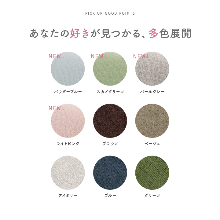 | パウダーブルー/スカイグリーン/パールグレー/ライトピンク/ブラウン/ベージュ/アイボリー/ブルー/グリーン |