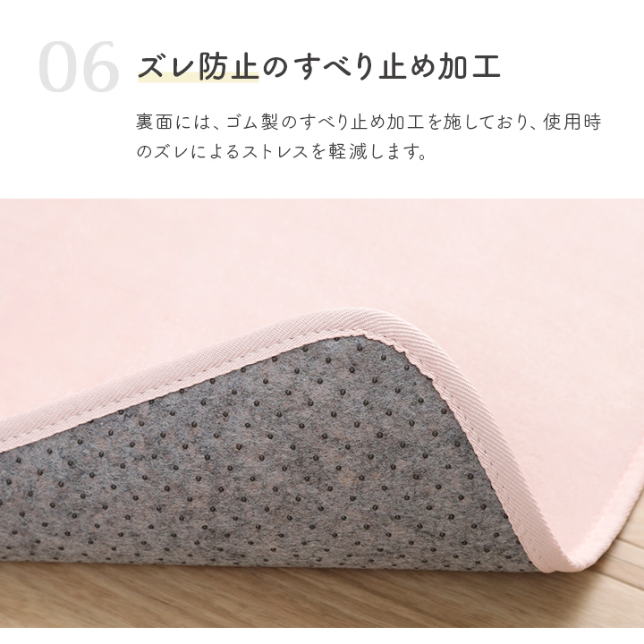 | 表地=ポリエステル100%【フランネル調】※抗菌防臭加工 裏地=ポリスエステル100%【不織布】※すべりにくい加工 中材=ウレタンフォーム1mm ヘリ=PPテープ |