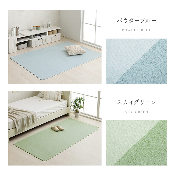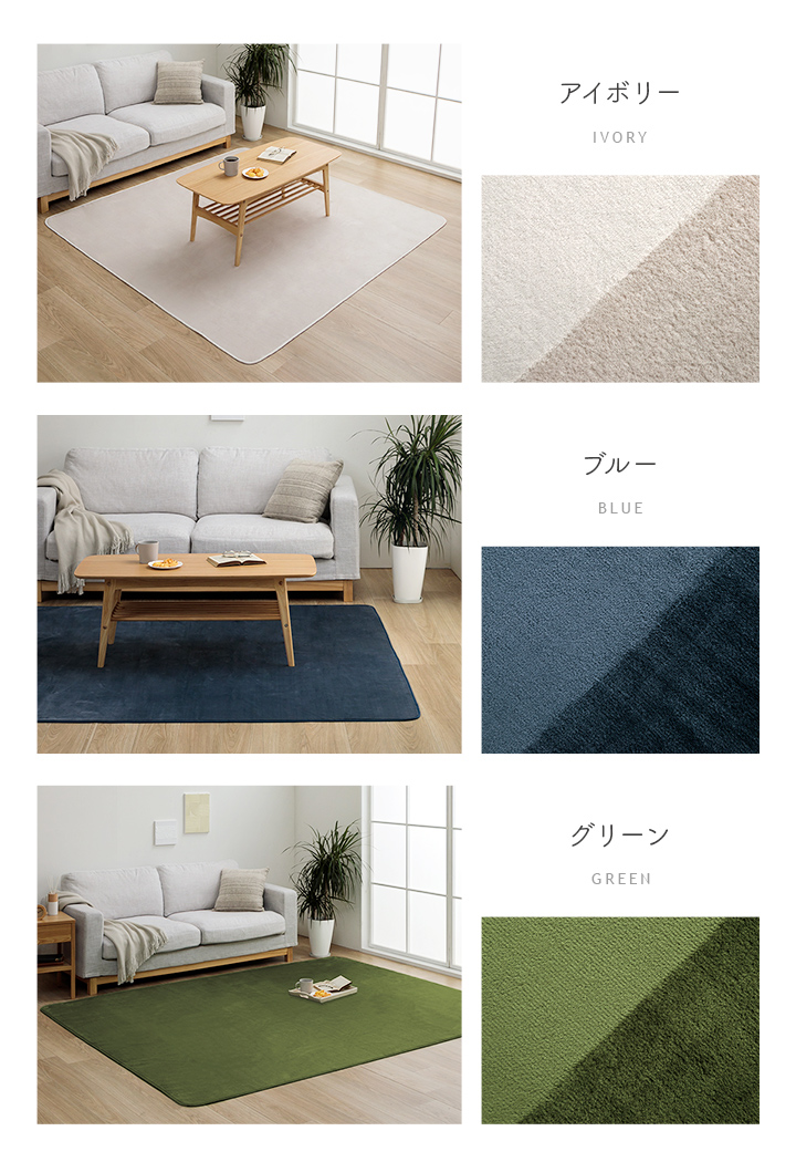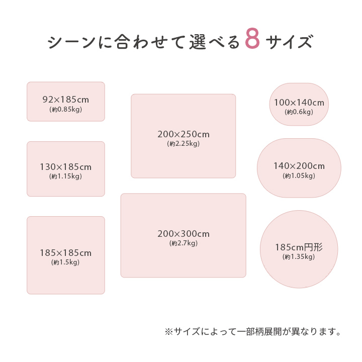 | 92×185cm(約1畳) 130×185cm(約1.5畳) 185×185cm(約2畳) 200×250cm(約3畳) 200×300cm(約4畳) 185cm丸 100×140cm楕円 140×200cm楕円 |