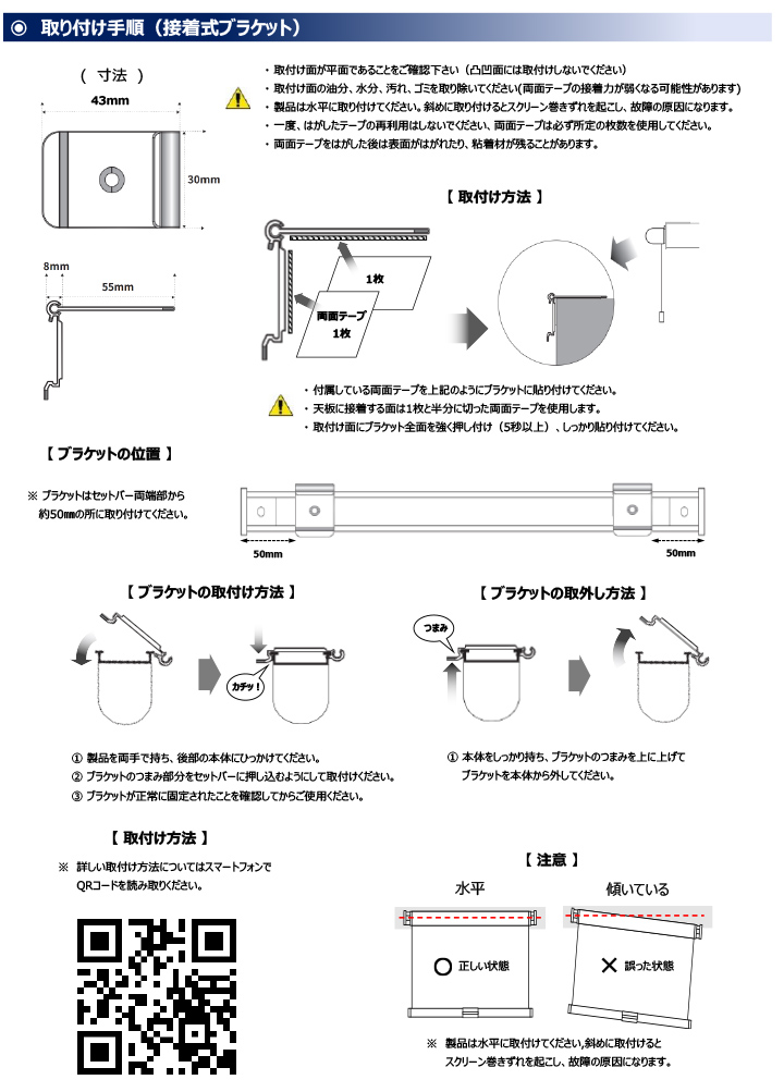 | ■スチールラック用ロールスクリーン専用のL字接着式ブラケットです。※ロールスクリーンは別売りです。 ■カラーボックスなどへの取り付けに最適です。 ※取扱説明書に記載されているブラケット取付数量と取付位置は、必ずお守りください。本体が落下する恐れがあります。 ※取り付け、使用される際は取扱説明書をお読みください。 ※取付け面が平面であることをご確認下さい。(凸凹面には取付けしないでください) ※取付け面の油分、水分、汚れ、ゴミを取り除いてください。(両面テープの接着力が弱くなる可能性があります) ※製品は水平に取り付けてください。斜めに取り付けるとスクリーン巻きずれを起こし、故障の原因になります。 ※一度はがしたテープの再利用はしないでください。両面テープは必ず所定の枚数を使用してください。 ※両面テープをはがした後は表面がはがれたり、粘着材が残ることがあります。 |