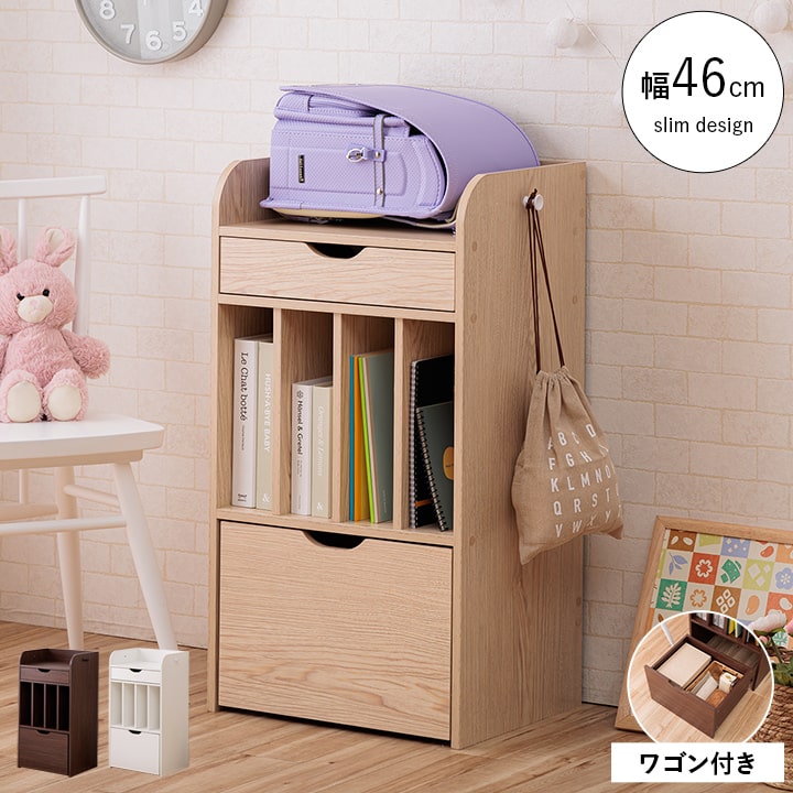 | ■取っ手のないシンプルなデザインで永く幅広く使える設計です。 ■お部屋になじみやすい無地・木目調デザイン。 ■収納に便利なワゴン付き。 ■様々なものを収納できるような設計にしました。 ■教科ごとに教科書を分けて入れることができます。 ■フック付き ※こちらの商品は【組立品】です。 ※組立時間の目安:約1時間 ※側面に付いているフックの耐荷重は約5kgです。 |