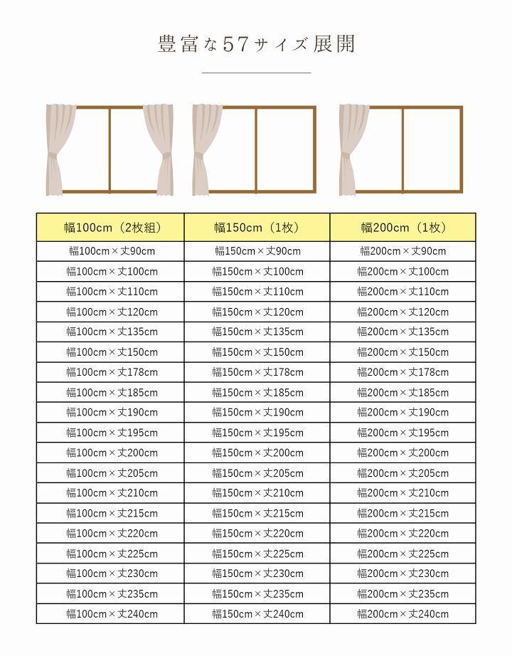 | サイズ | 【幅100cm 2枚組】 幅100×丈100cm2枚組 幅100×丈135cm2枚組 幅100×丈178cm2枚組 幅100×丈200cm2枚組 幅100×丈210cm2枚組 幅100×丈220cm2枚組 【幅150cm 1枚入】 幅150×丈135cm1枚 幅150×丈178cm1枚 幅150×丈200cm1枚 幅150×丈220cm1枚 【幅200cm 1枚入】 幅200×丈135cm1枚 幅200×丈178cm1枚 |