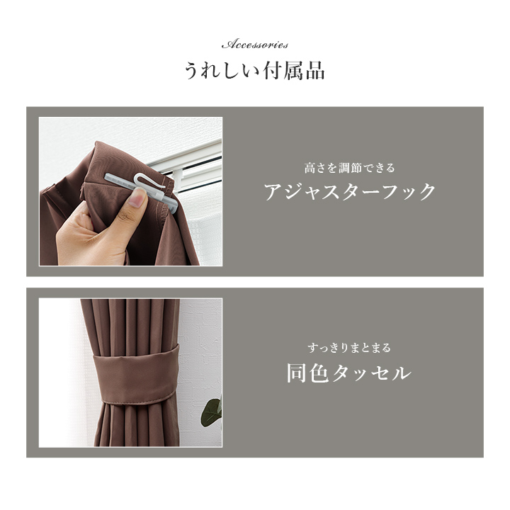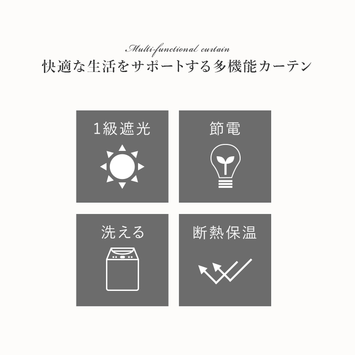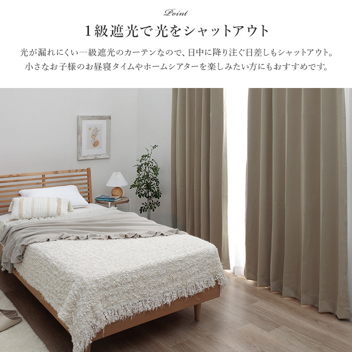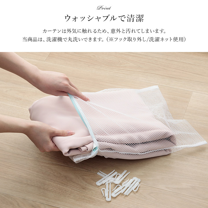 | ■ 快適な生活をサポートする多機能カーテン。 ■ 光が漏れにくい一級遮光のカーテンなので、日中に降り注ぐ日差しもシャットアウト。 小さなお子様のお昼寝タイムやホームシアターを楽しみたい方にもおすすめです。 ■ 断熱・保温効果で冷暖房効率がアップし、省エネ効果が得られます。 窓から伝わる熱や冷気を遮るため、夏は涼しく、冬は部屋を保温してくれます。 ■ カーテンは外気に触れるため、意外と汚れてしまいます。当商品は洗濯機で丸洗いできます。 ■ 高さを調節できるアジャスターフックや同色タッセルが付属しています。 ■ 本商品は遮光性を高めるため、黒色の糸を織り込んでいます。そのため、カラーによっては生地の織り目から黒い糸がわずかに見える場合がございます。 |