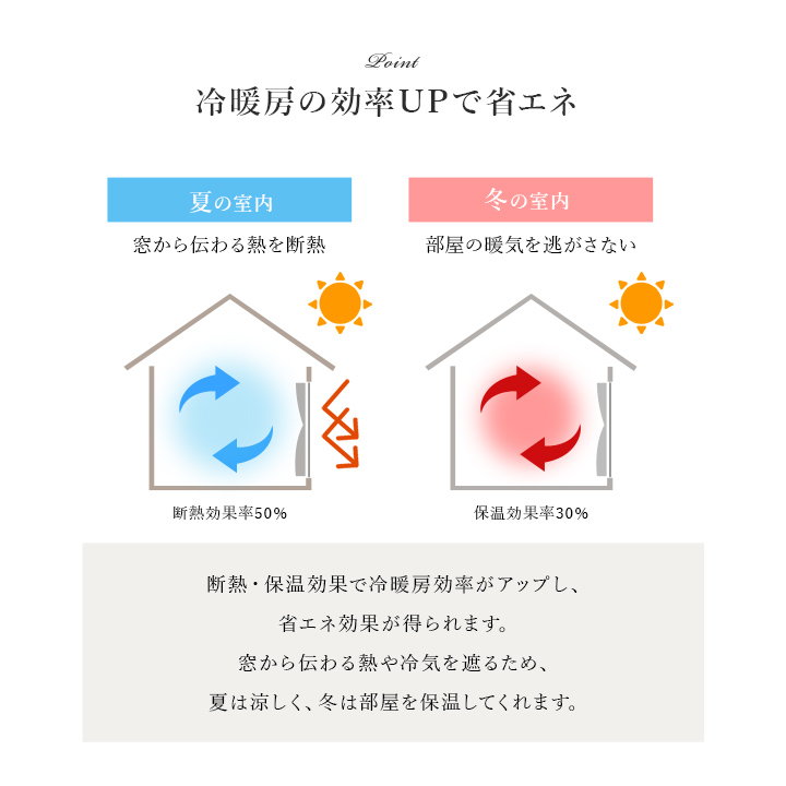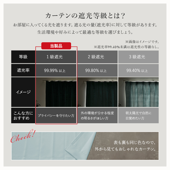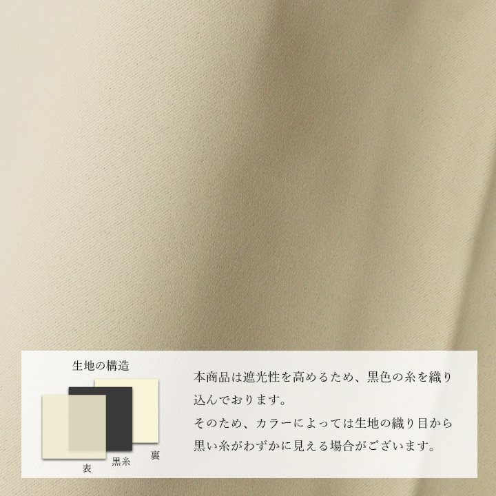 | 1級遮光 断熱効果率50% 保温効果率30% ※1級遮光について薄い色は濃い色より光を通しやすくなります。 |