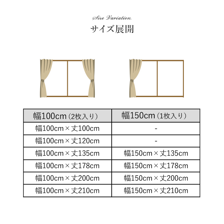 | 約100×100cm 2枚組/約100×120cm 2枚組/約100×135cm 2枚組/約100×178cm 2枚組/約100×200cm 2枚組/約100×210cm 2枚組/約150×135cm 1枚組/約150×178cm 1枚組/約150×200cm 1枚組/約150×210cm 1枚組 |
