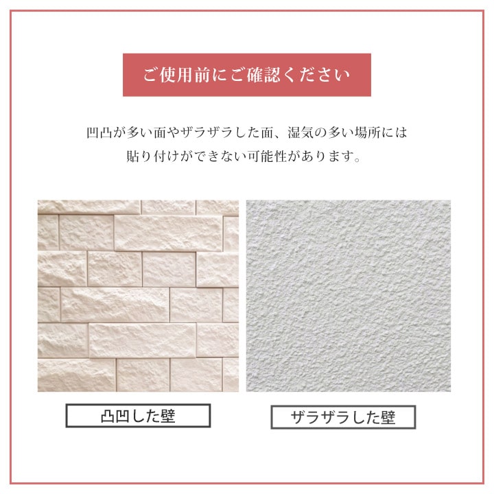 ・凹凸が多い面やザラザラした面、湿気の多い場所では貼り付けができない場合があります。