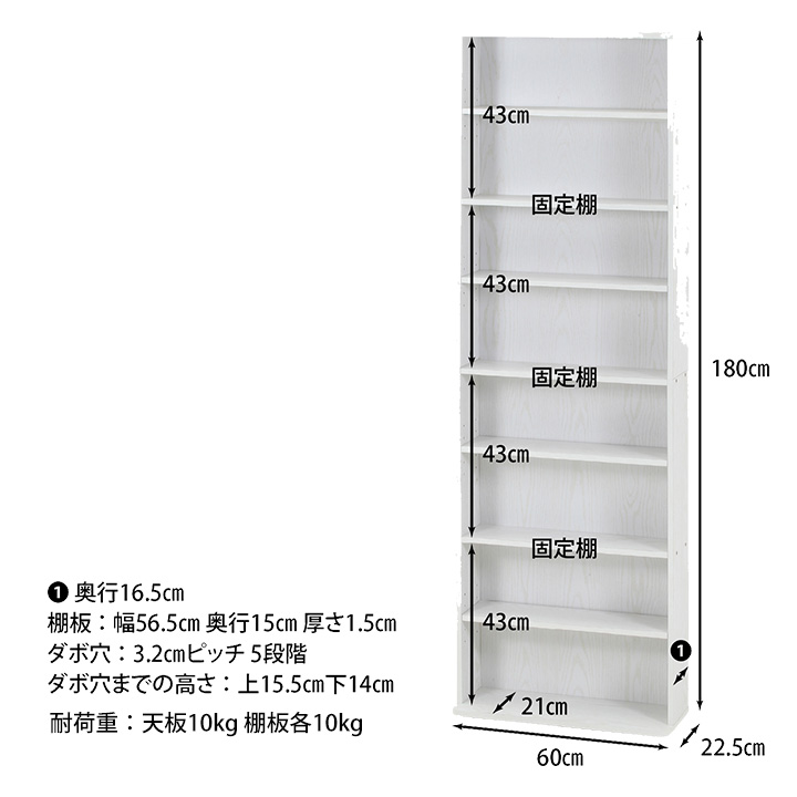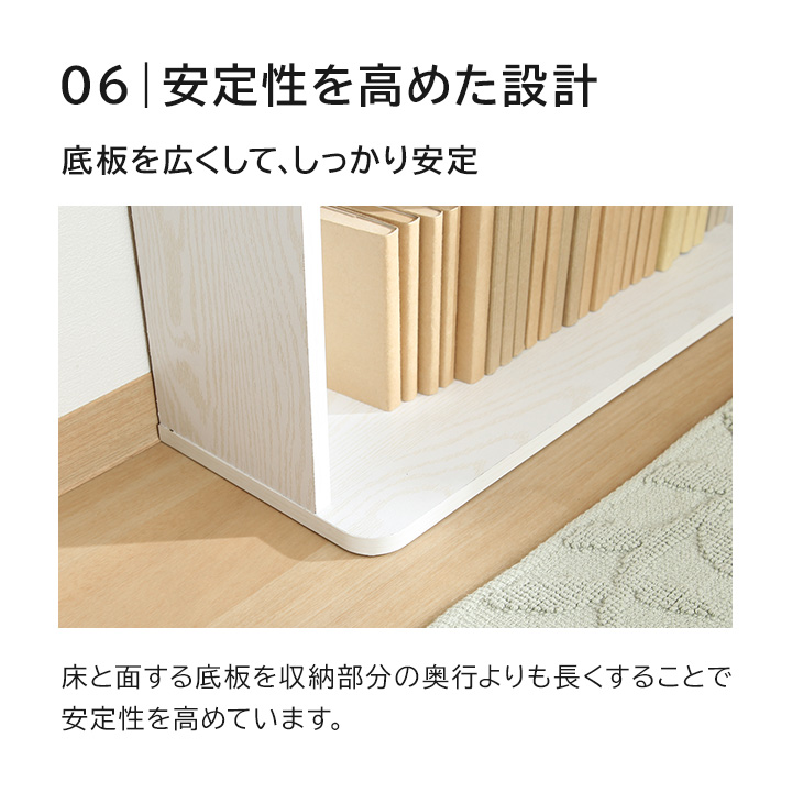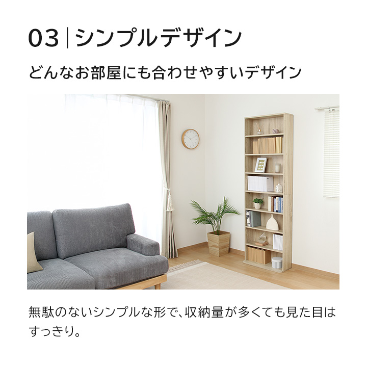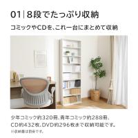 | ■ どんな場所にも合うベーシックなデザイン。大容量ですっきり収納できます! ■ 少年コミックで約320冊、青年コミックで約288冊、CD約432枚、DVD約296枚とこれ一つでしっかり収納できます。(※収納枚数はあくまで目安です) ■ 奥行22.5cmのスリムな形のため、狭い場所でも圧迫感がなく使用できます。 ■ 書籍やCDだけでなく、写真立てやお気に入りのコレクションを飾って楽しむこともできます。 ■ 床と面する底板を収納部分の奥行よりも長くすることで、安定性を高めています。 ■ 木目調と落ち着いたカラーでお部屋に馴染みます。 |