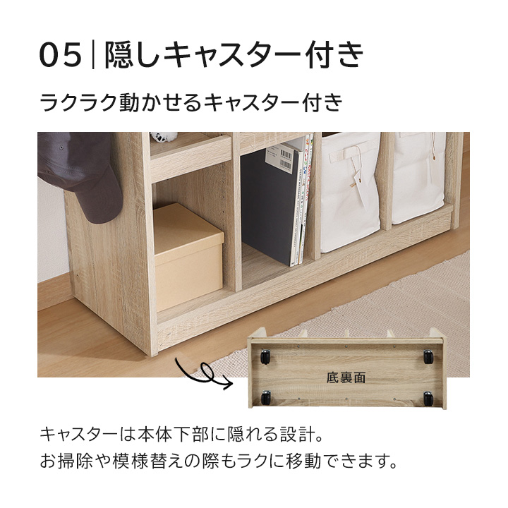 ■お子様が使いやすい高さ60cmのロータイプです。また、隠しキャスター付きなので、お掃除の際の移動も楽々です。