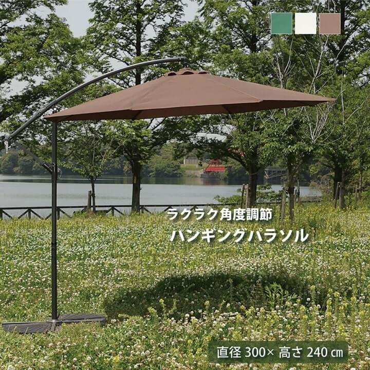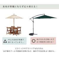 ■ おしゃれな直径300cm大型パラソルです。 ■ クランクを回して傘を開閉できるので、取扱いが簡単です。 ■ 収納時も折りたためるのでスペースを取りません。 ■ 庭やデッキ、テラスなど使用できる場所は様々です。アウトドア、バーベキュー、バルコニーでの読書などのシーンにどうぞ。 ※ 腐敗の原因となりますので、長期間の屋外での使用は避けてください。 ※ 一般家庭での使用を想定して設計しております。業務用を目的とするご購入はお控えいただきますようお願い申し上げます。 ※ お客様組み立て品です。 ※ ハンギングパラソルベースは別売りとなります。»ハンギングパラソル用ベース 12kg ※ 画面上のカラーはご使用ブラウザやモニターの設定により、実物とは若干異なる場合がございます。あらかじめご了承の上、ご注文をお願いいたします。 | |