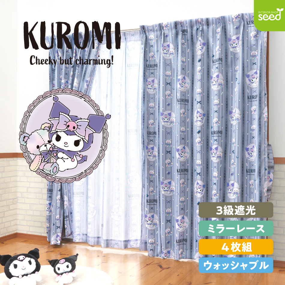 100×110cm 4枚組 サンリオ クロミ パステルベア 3級 遮光カーテン と ミラーレース カーテン 4枚セット