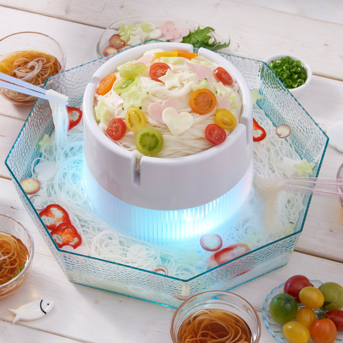 涼しく楽しい流しそうめんを自宅やアウトドアで!LEDライトで彩りを添え、製氷カップでひんやり感をキープ。