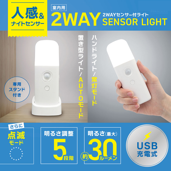 センサーライト 充電式 人感センサー ナイトライト 明暗センサー 足元灯 明るさ 5段階 自動点灯 スタンド付 ハンディライト 防災 防犯 /60N◇ 2WAYセンサーM