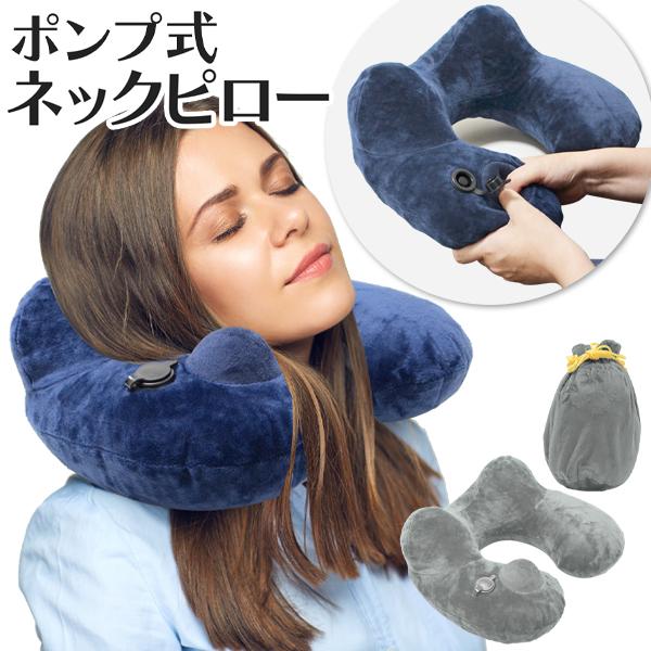 送料無料-ポンプ内蔵 ネックピロー 簡単 手押し 膨張 トラベルピロー ポーチ付属 丸洗いOK 旅行 新幹線 飛行機 車中泊 クッション 60N◇ ポンプ式ネック枕