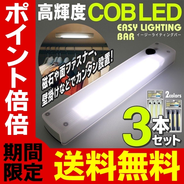 LEDバーライト 3個セット スイッチ一体型 COB 電池式 磁石 壁掛け 面ファスナー 配線不要 クローゼット 足元灯 送料無料 3M◇ 3本イージーライト