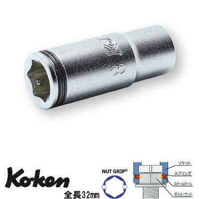 奥まった場所のボルト/ナットを落とすことなく着脱可能で、尚且つアルミやステンレス、チタンといった非磁性素材のボルト/ナットも掴むことのできるナットグリップソケットに待望のセミディープタイプを追加ラインアップ。特長:ソケットの六角開口部に備えた2つのスチールボールでボルト/ナットをしっかりホールドします。狭くて手が入らず奥までボルト/ナットを運ぶとき、また手の届かない場所での作業に威力を発揮します。マグネット式に比べて利点が多く、一般の六角ソケットなどと外径が同じですので、違和感なく保持機能のみ付加されます。【2350X12】