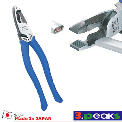 VVF線切断の決定版。4芯(Φ2.0mm)を楽に切断します。今までいない斬新なデザイン!ペンチの形をしたはさみというイメージ切り口がつぶれたり、歪んだりする事なくきれいにカットできます。またワイヤーの編み込みをばらすことなくカットできます。鉄線はφ2.0mm,銅線はφ3.2mmまで切れます。全長(220mm)が長いわりに柄幅が狭いので力が入りやすくラクラク切断が出来ます。新潟 3Peaks スリーピークス技研製品