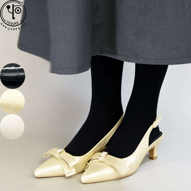 ヨースケ YOSUKE バックストラップパンプス ポインテッドトゥパンプス リボン とんがり レディース 黒 白 ゴールド 2820035