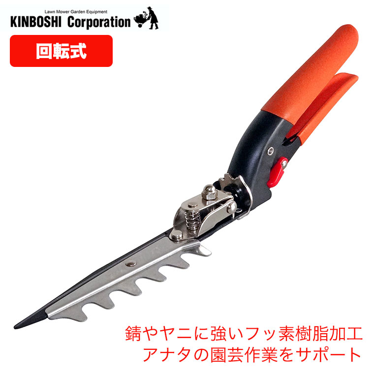 キンボシ(ゴールデンスター)の回転式芝生鋏レーキ付(フッ素樹脂コート)。