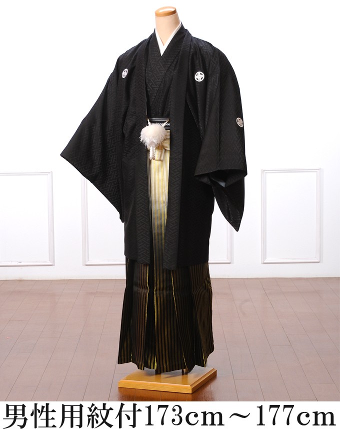 紋付袴 レンタル8AF10【紋付き】[羽織袴レンタル]〔男性〕〔紳士〕〔着物〕〔結婚式〕〔卒業式〕〔男袴〕〔貸衣装〕【6号】【173cm〜177cm位まで】【黒】【金縞袴】【グラデーション】足袋プレゼント★往復送料無料★
