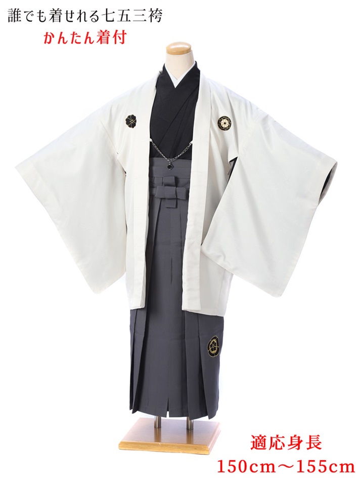 かんたん着付け 小学生 卒業式 男 ジュニア用紋付袴セットレンタル8AQL33 紋付きフルセット 着物レンタル 12歳〜13歳 150cm〜155cm位まで 白 グレー袴 爆買