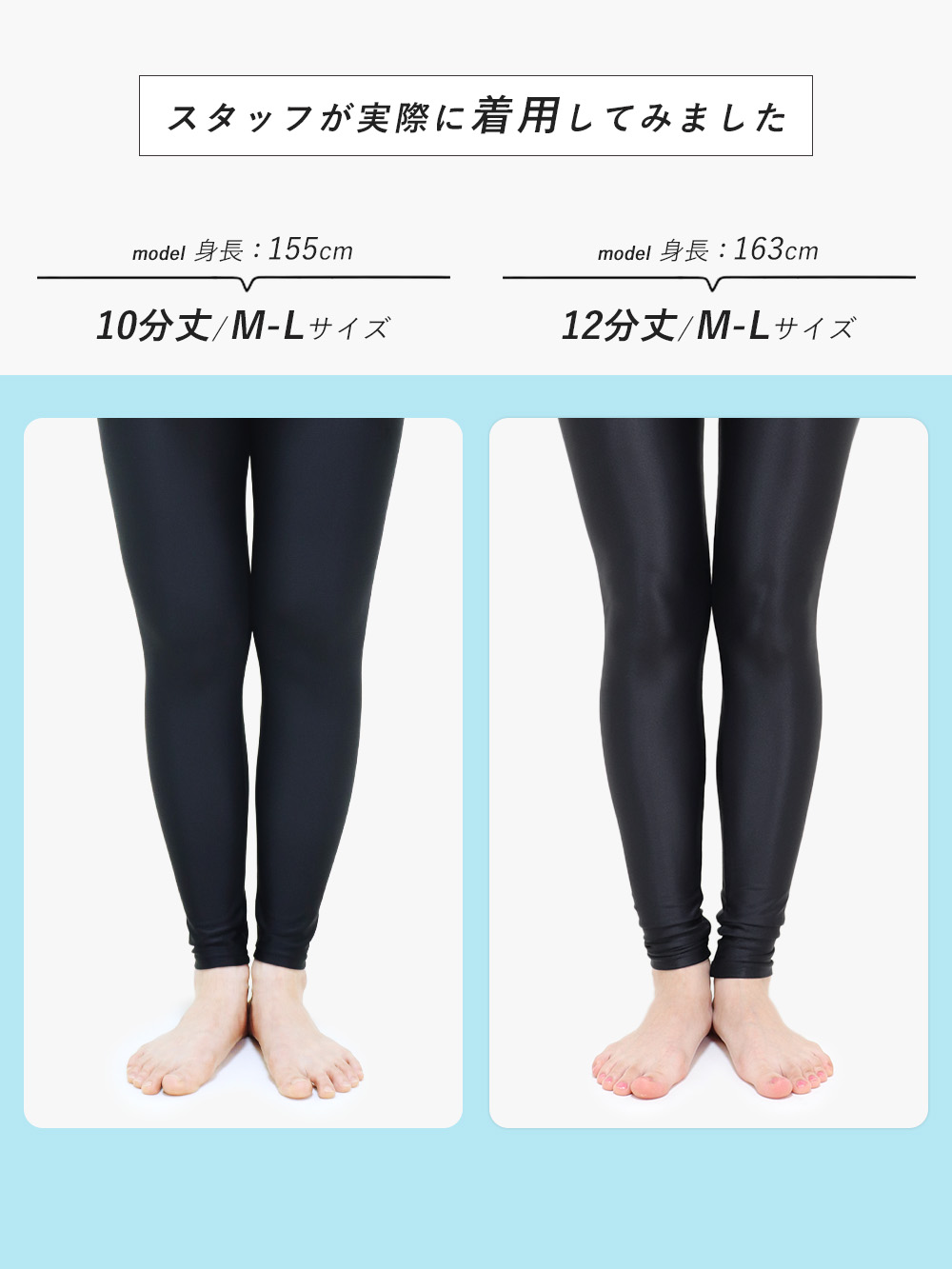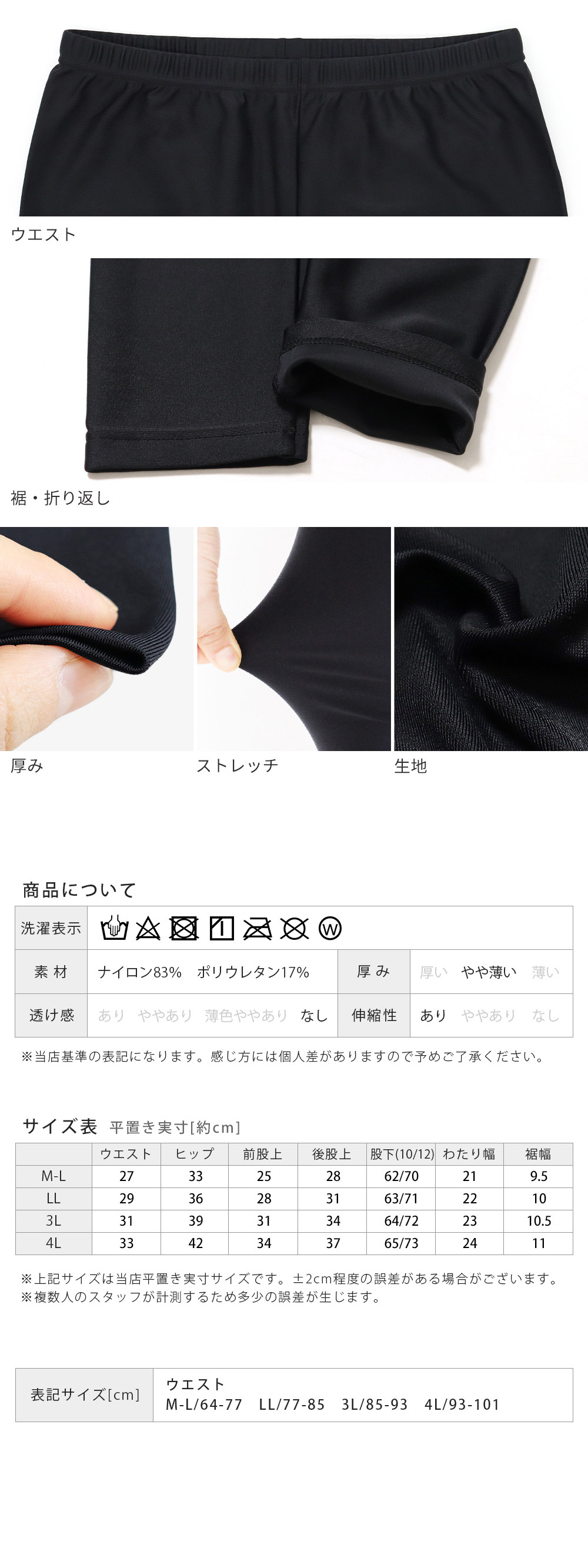 股下は10分丈・12分丈の2タイプ、サイズはM-L、LL、3L、4Lまで展開。
