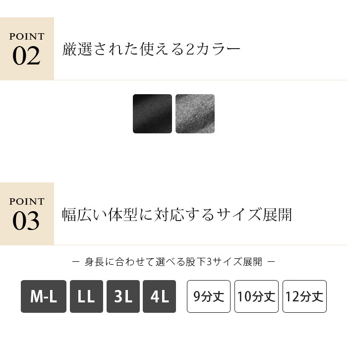 9分丈は低身長の方に、12分丈は高身長の方におすすめです。