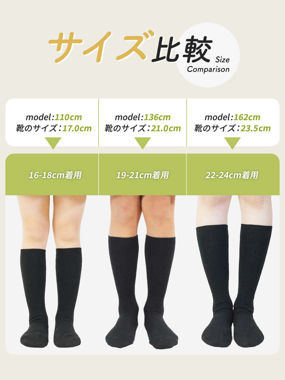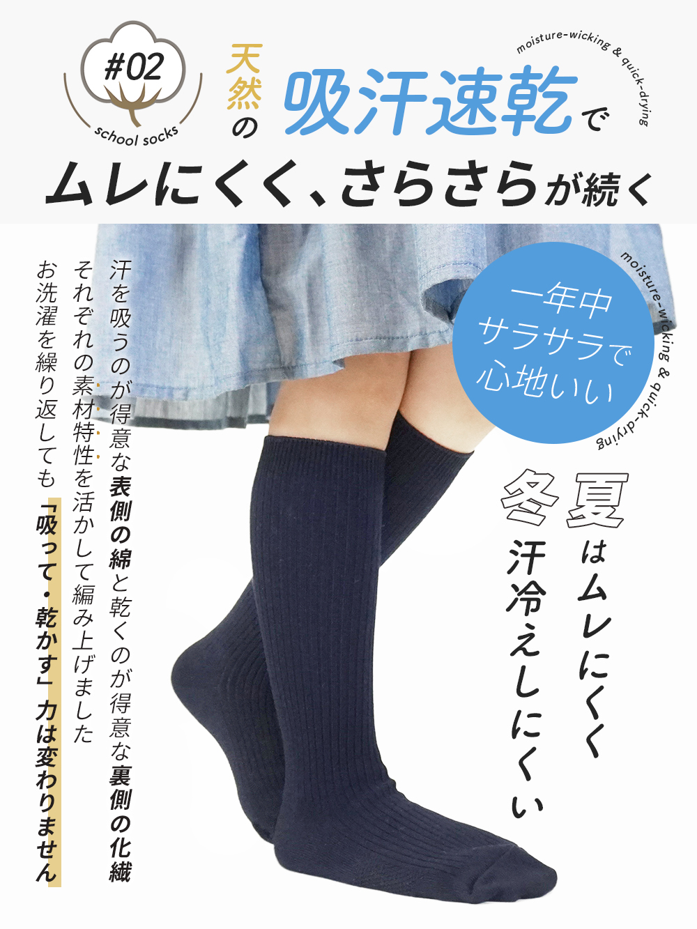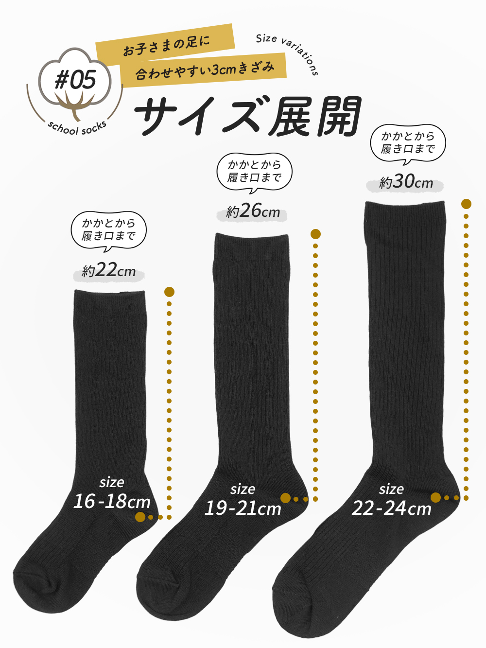膝下まで優しく包み込むハイソックス丈は、お子様の体格に合わせて美しく履きこなせる最適な長さに設計しており、スカートやハーフパンツとのバランスも抜群です。