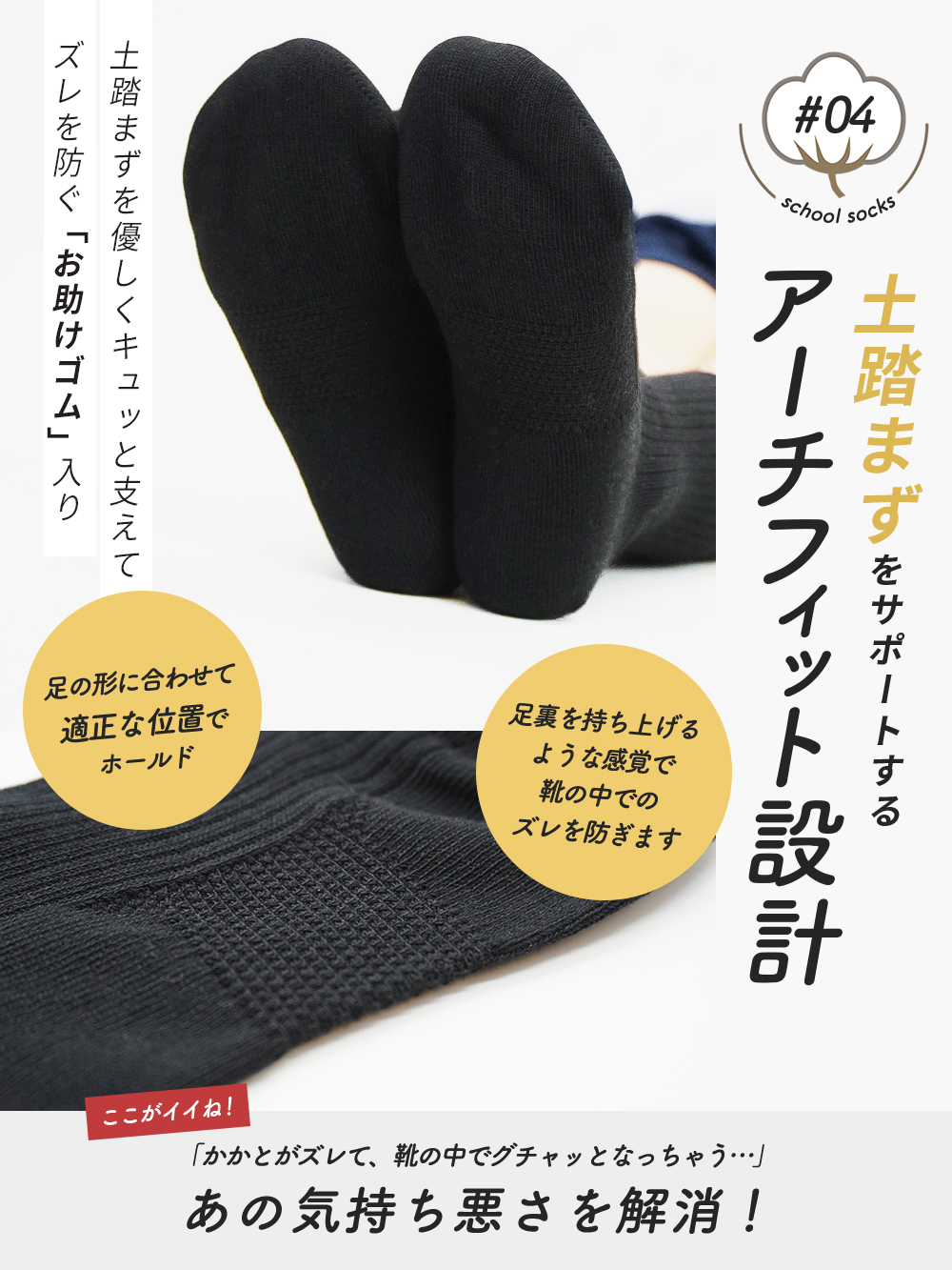特に傷みやすいつま先とかかと部分を補強し、活発に動く通学や体育の時間でも破れにくい丈夫な設計に仕上げたほか、