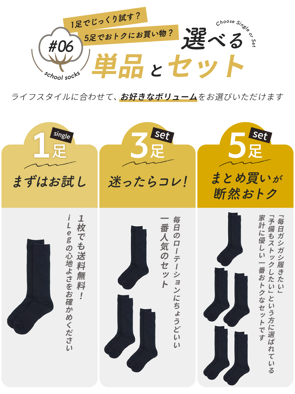 まずは試してみたい方のための1足単品から、洗い替えに便利な3足セット、そしてストックまで十分な嬉しい5足セットまで、