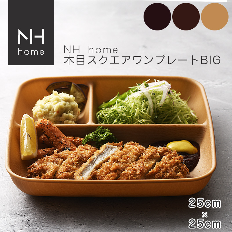 軽くて丈夫で割れにくい、電子レンジ、食洗機に対応した使い手に優しいナチュラルカフェテイスト食器。木目が目を惹くNHhome木目スクエアワンプレートBIGです。