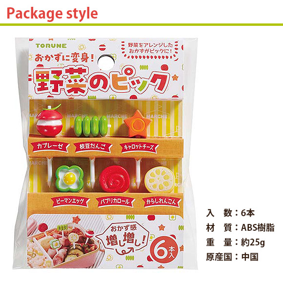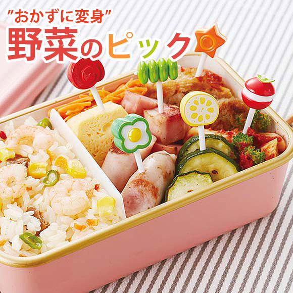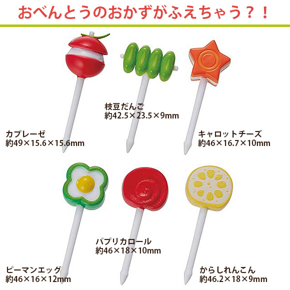 | お弁当のおかずを手軽に楽しく!野菜をアレンジしたオシャレなおかずがピックになったよ。お好きなおかずにさすだけで簡単彩り★お弁当やパーティーに大活躍ですね。繰り返し洗って使えるので、とってもエコなところも嬉しいですね。 |