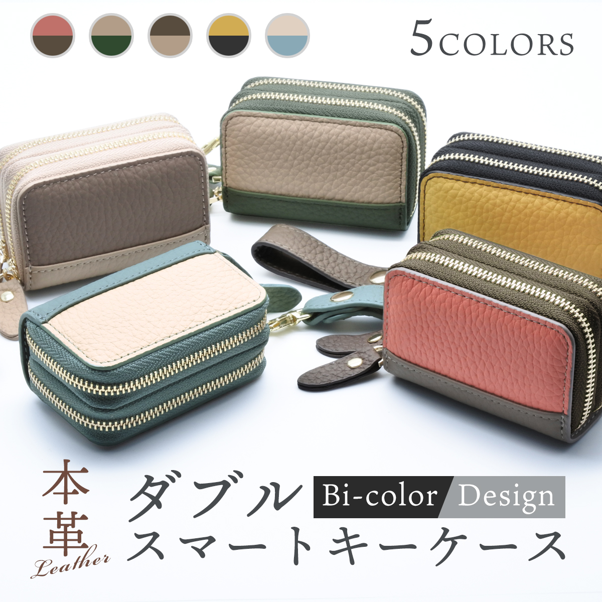 ダブルファスナー 牛革 スマートキーケース 2個 収納 バイカラー ファスナー ストラップ付 ホック かわいい レザー シンプル 本革 シボ革 キーケース キーホルダー 鍵 ホルダー スマートキー くすみカラー メンズ レディース ユニセックス 収納 かぎ カギ 車 人気 オススメ 高品質 10代 20代 30代 40代 50代 60代 プレゼント 誕生日 ギフト 贈り物 シボ 牛革 コンパクト 小さめ おしゃれ おすすめ