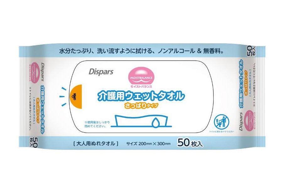 「ディスパース モイストバランス 介護用ウェットタオル さっぱりタイプ」は、お肌にやさしいノンアルコール&無香料の大判ウェットタオルです。