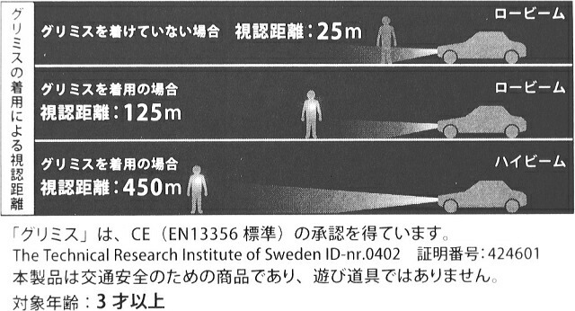 グリミスはリフレクター(反射板)を使用し、暗闇でもドライバーに歩行者の存在を知らせる交通安全グッズです。ジャケット、バッグ、ベビーカー、ペット等につけてお使いいただけます。