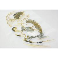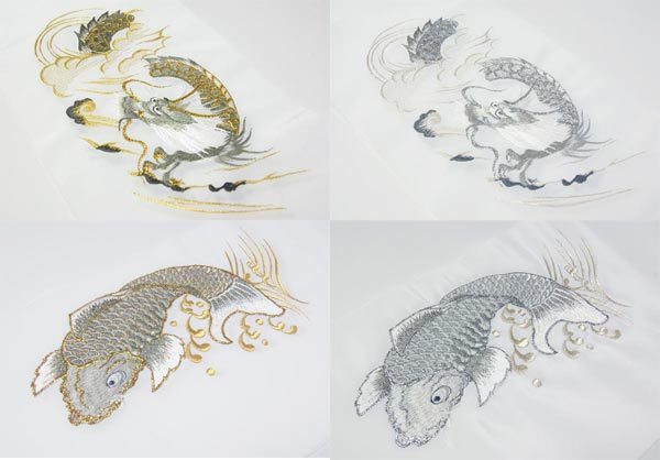 生地が白色のポリエステルに昇り龍と鯉の滝登りの刺繍柄で、金や銀糸も施されています。