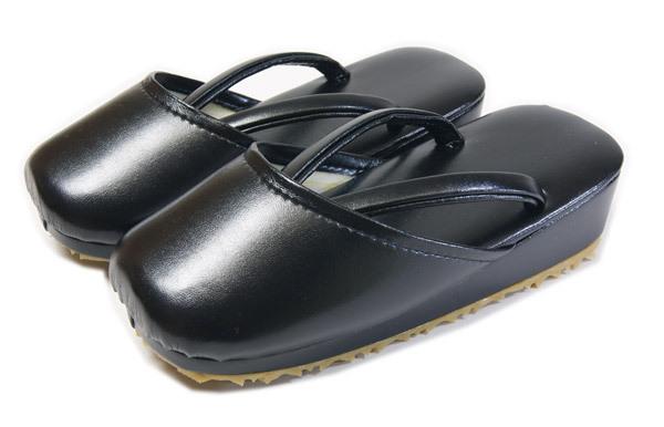 雨、雪の際に足袋が汚れにくいカバー付草履、黒の合皮レザーに硬質ゴムに滑り止め形状の底。