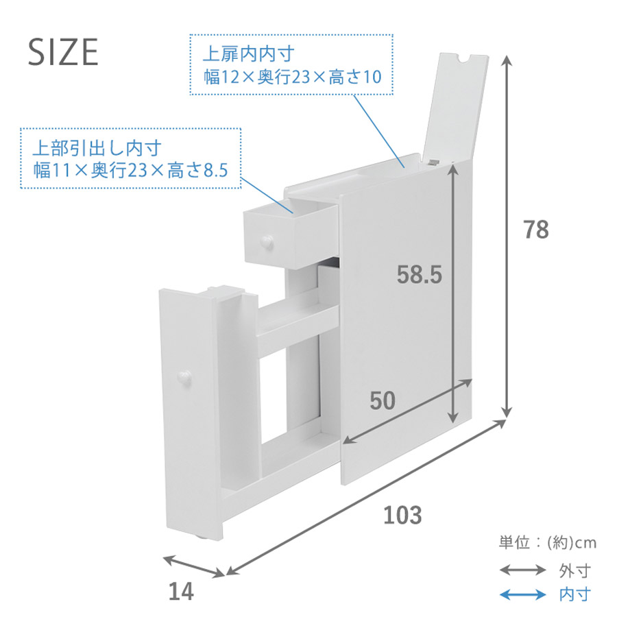 | スリムなのにペーパーロールや掃除用品をたっぷり収納。幅14cmの省スペーストイレラック。 ■引出内寸:(約)幅11×奥行23×深さ8cm | ||||