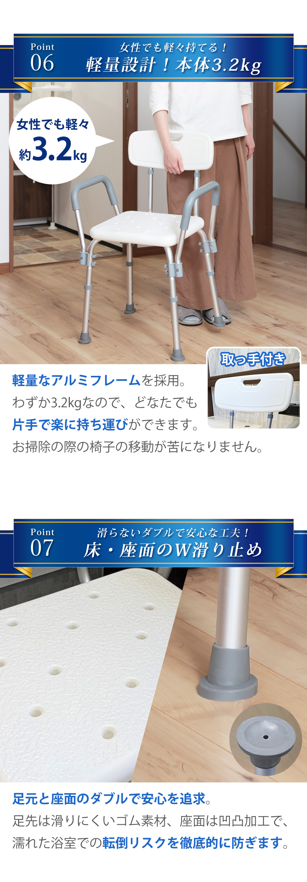 1.座面は穴あき仕様で水が溜まるのを防ぎます。表面の細かい凹凸で滑り止め効果も。