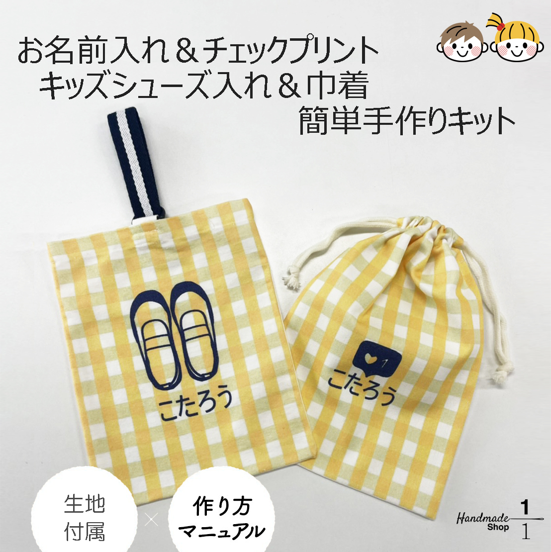 上履き入れ お名前入り かわいいチェック柄の上履き入れ&巾着 手作りキット 縫って!もOK 通園 入園 上履き 巾着 上靴 シューズバッグ