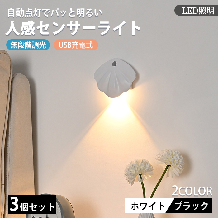 人感センサーライト センサーライト シェル型 貝殻 usb充電式 室内 トイレ 廊下 玄関 1200mAh 照明 ledセンサーライト 3個セット