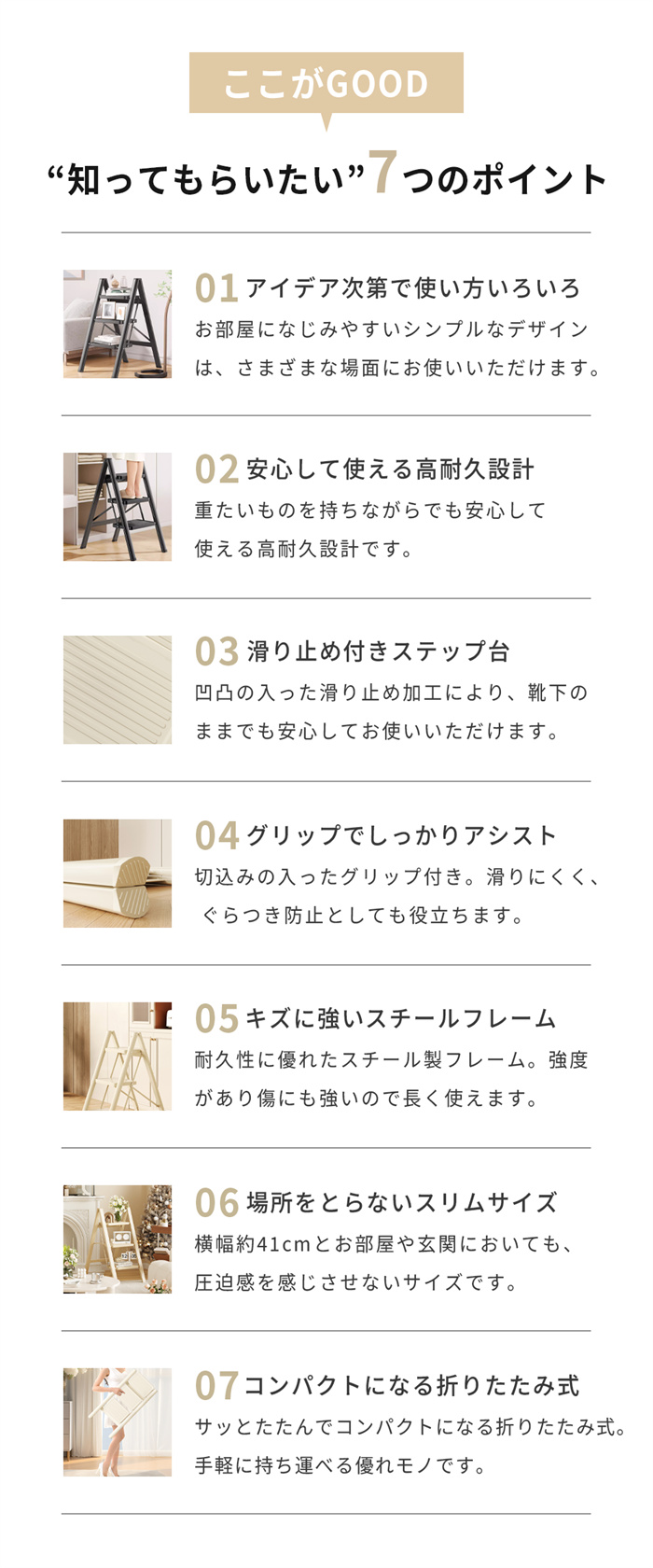 凹凸ストライプ滑り止めデザイン → 足元がしっかり固定され、踏み外し防止!