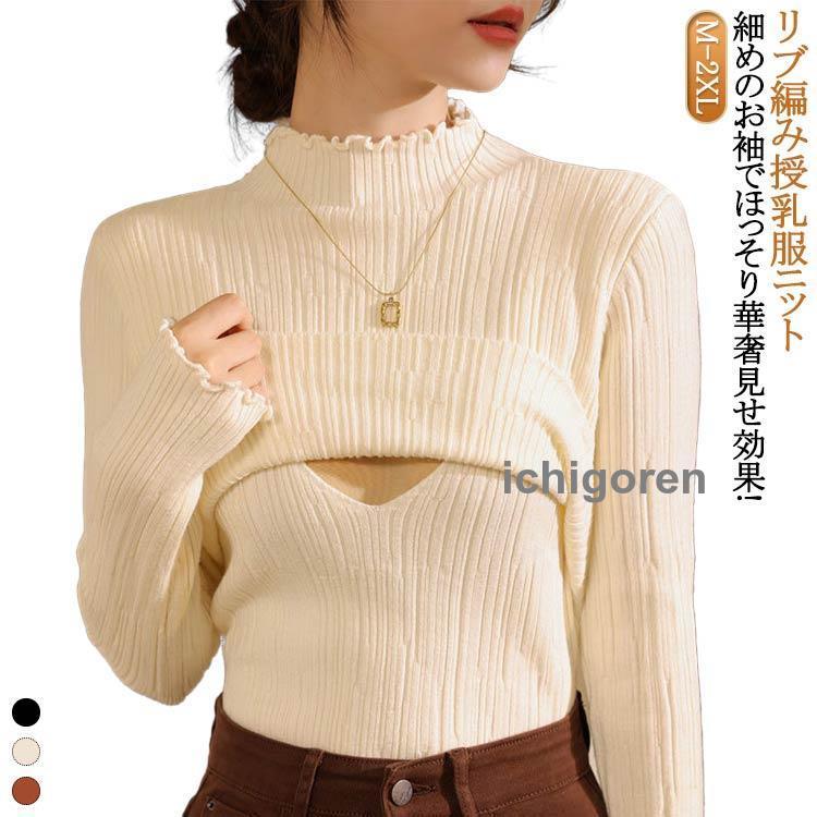 授乳服 マタニティ服 冬 ニット 授乳 授乳トップス 授乳 着痩せ リブニット 授乳服 冬 秋 長袖 セーター あったか 袖長め 体型カバー ニット
