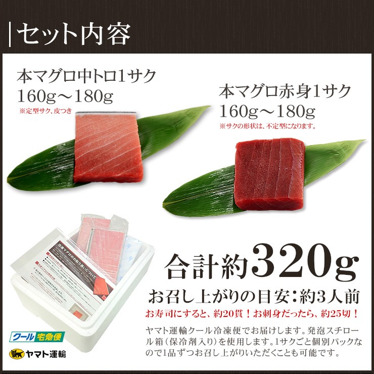 ●商品は冷凍状態で発送致します。●中トロは皮付きの商品になります。●赤身は不定形サクとなります。●重量は多少(10g程度)前後する場合があります。