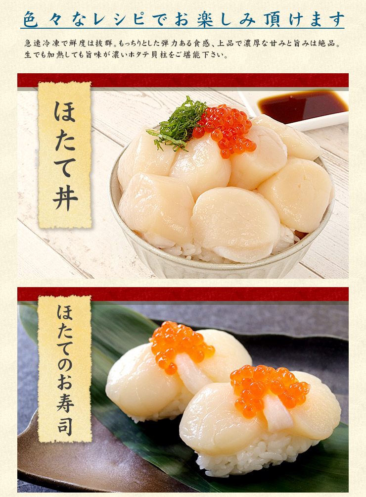 オホーツクで獲れた生ホタテをたっぷりお届け!お刺身、フライ、バター焼きなど色々なレシピでお召し上がりいただけます。バラ凍結なので小分けもOK!食べたい時に食べたい分だけ解凍してお召し上がり可能です!