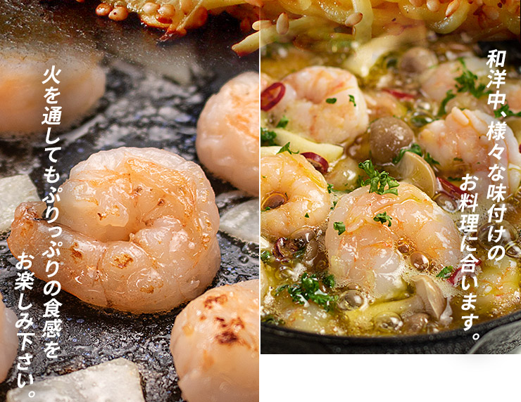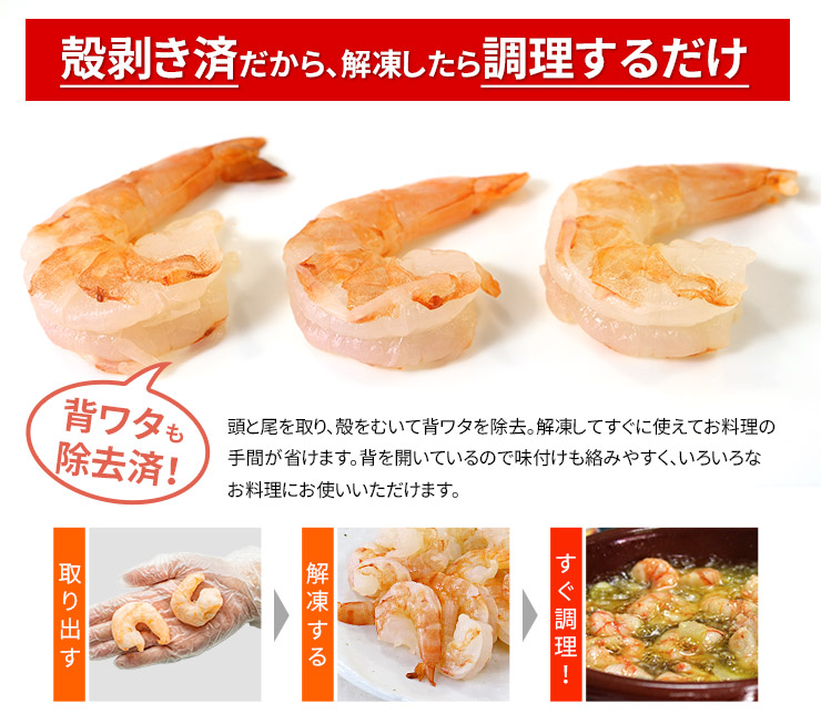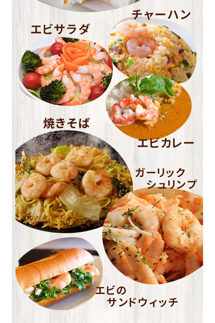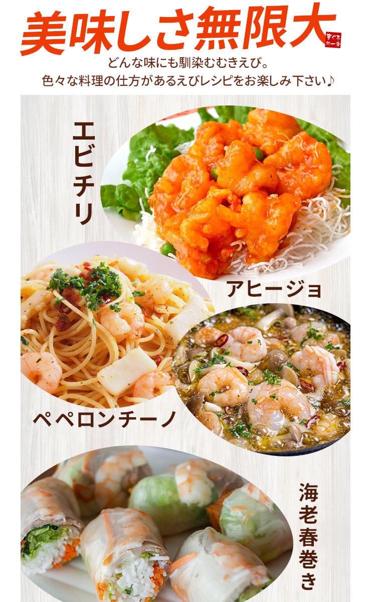 バナメイエビはソフトな食感と甘みが強いのが特徴、どんな料理にも合う優れもの。エビチリ、パスタ、グラタン、チャーハン、アヒージョ、焼きそばやサラダの具、お弁当にもぴったり!